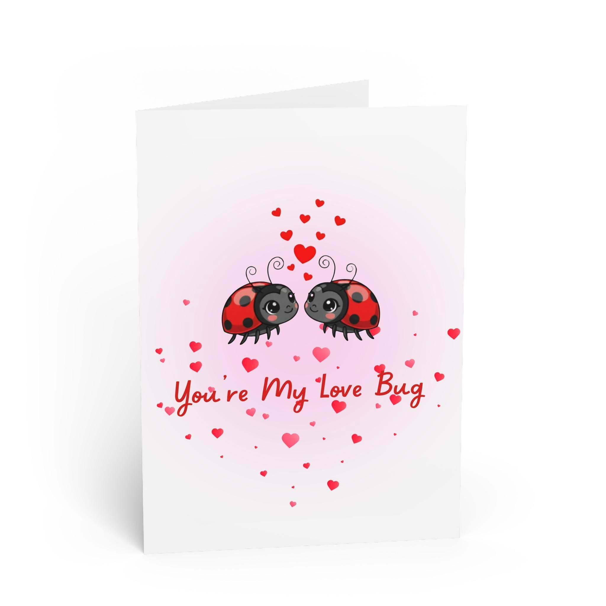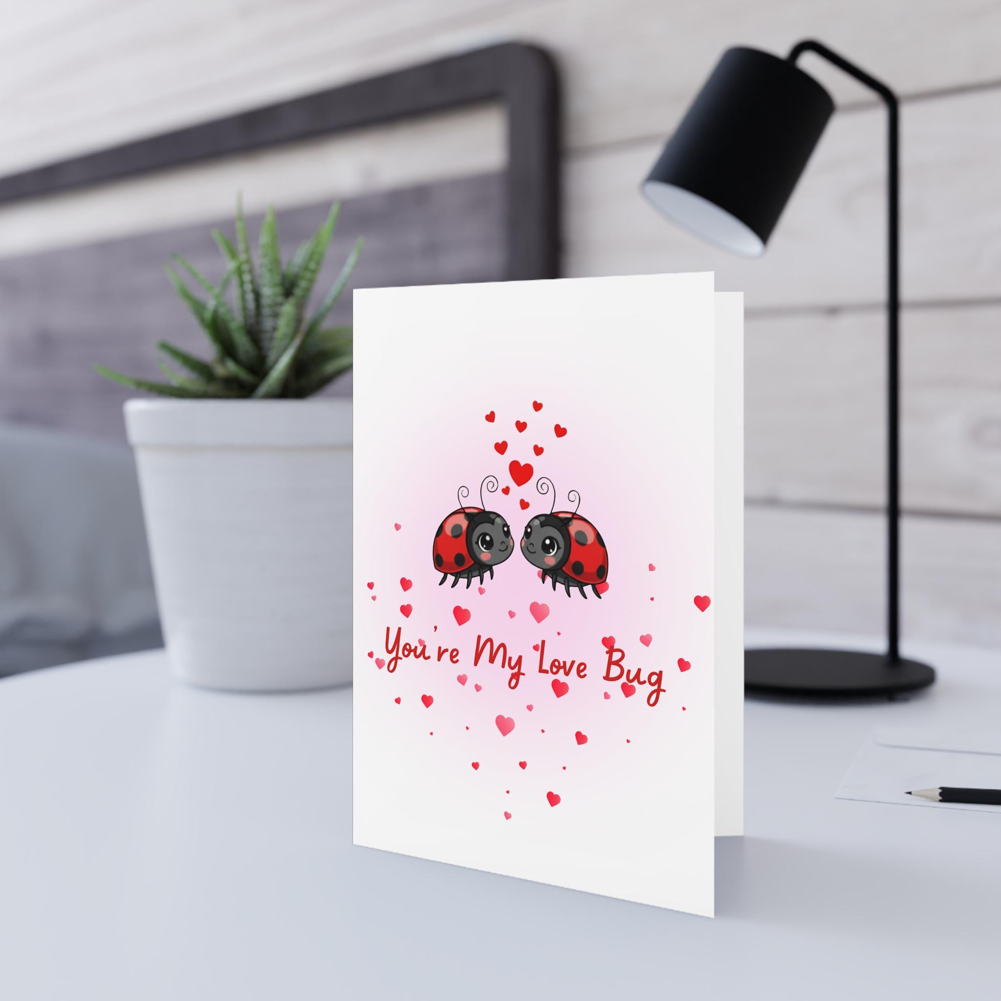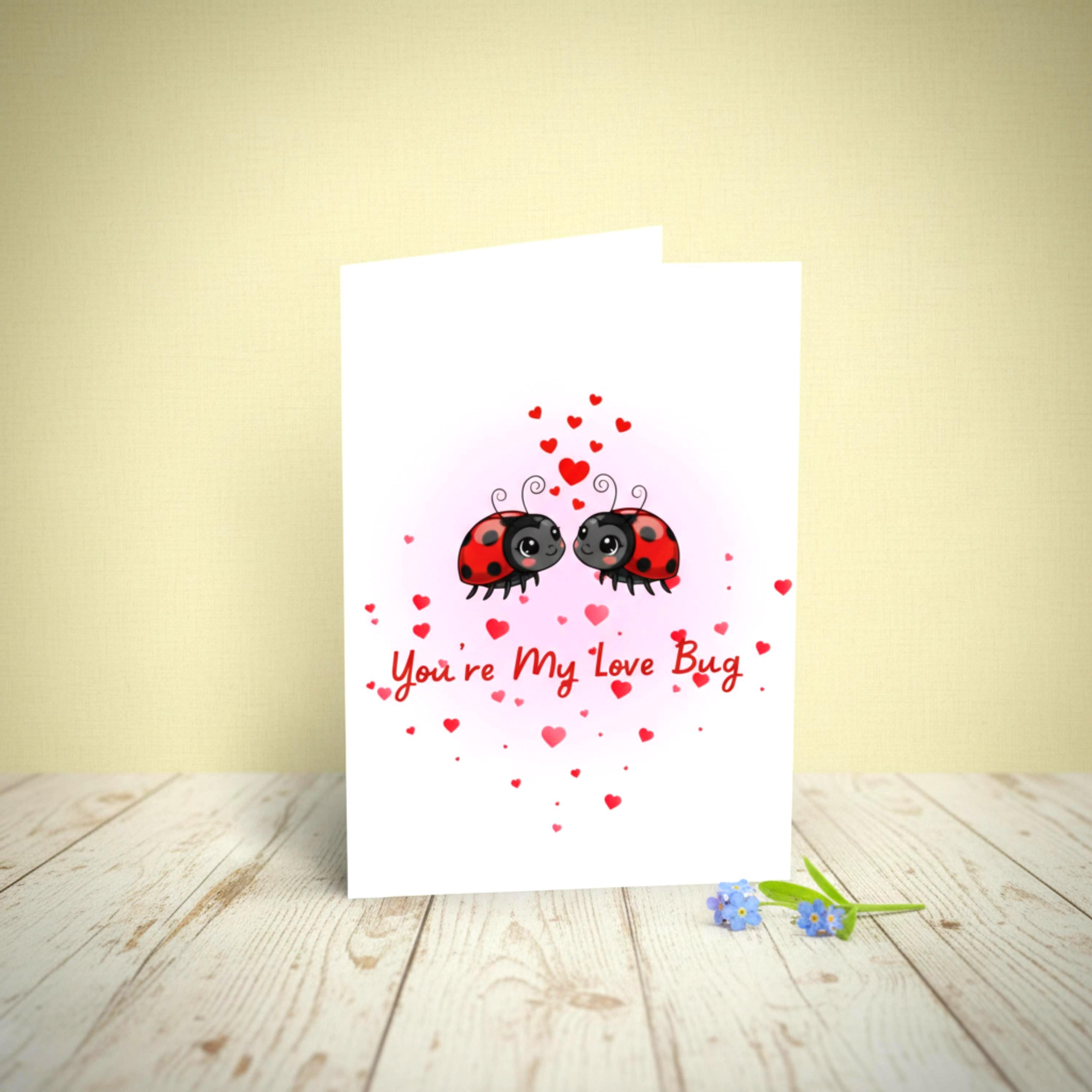 Two adorable ladybugs face each other amid a shower of pink and red hearts, with the handwritten message “You’re My Love Bug” beneath them. The illustration feels light and affectionate — like a quick, bashful whisper passed across a café table.
