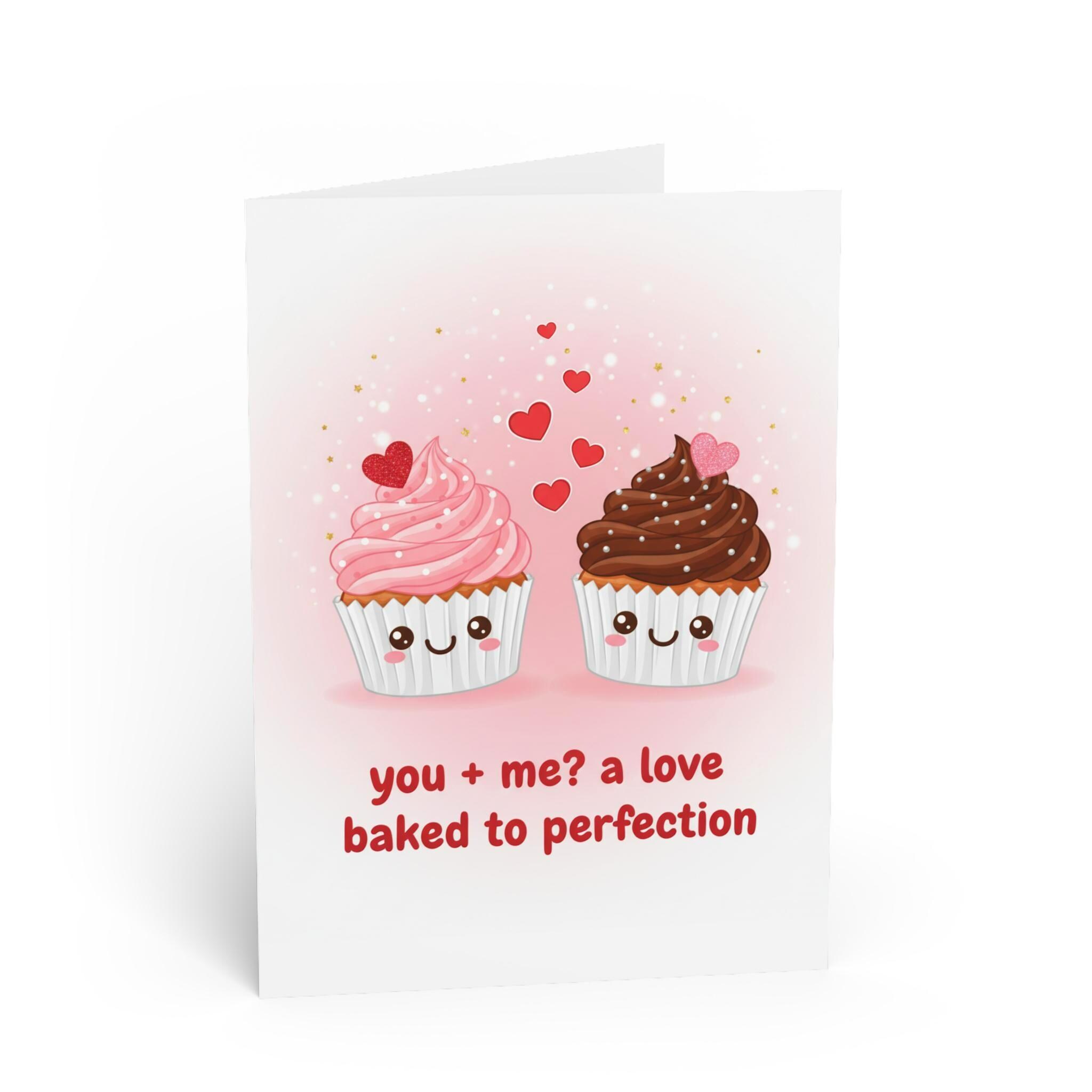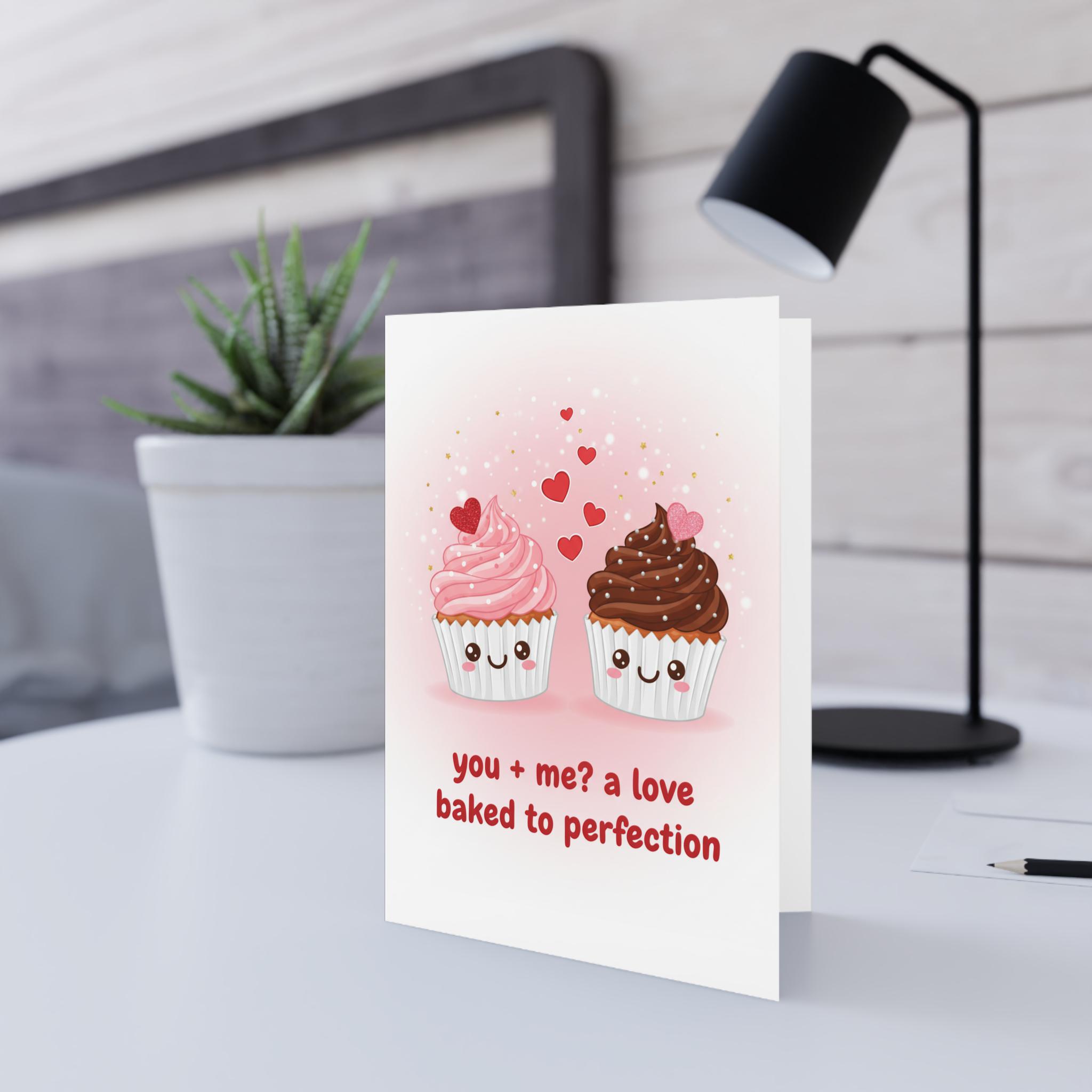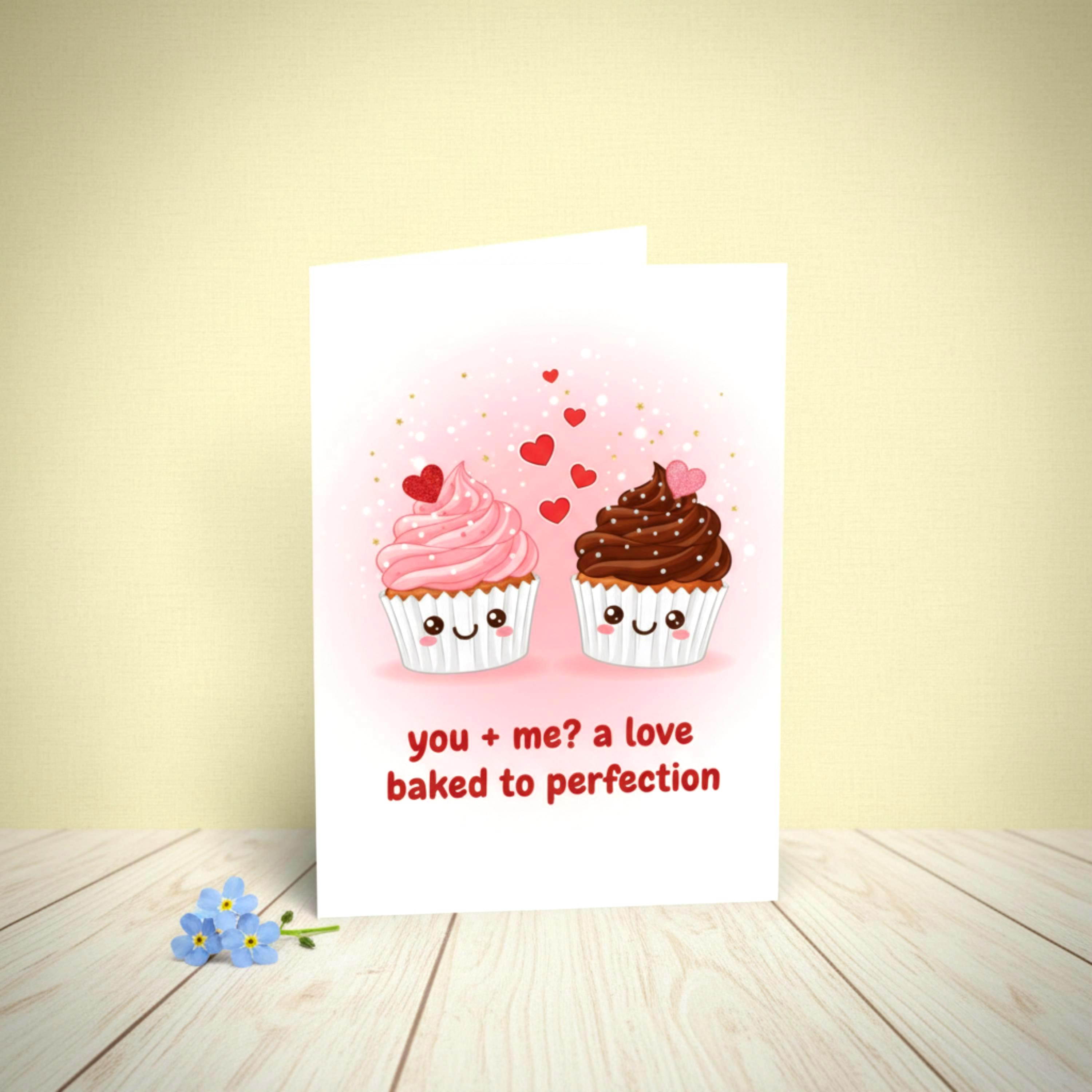 Two adorable cupcakes beam at each other on a soft pink, sparkle-dusted background — one frosted in pink, the other in chocolate, both tucked into crisp white liners. Little red hearts float between them, and the playful line “you + me? a love baked to perfection” sits beneath, like a wink from the oven.
