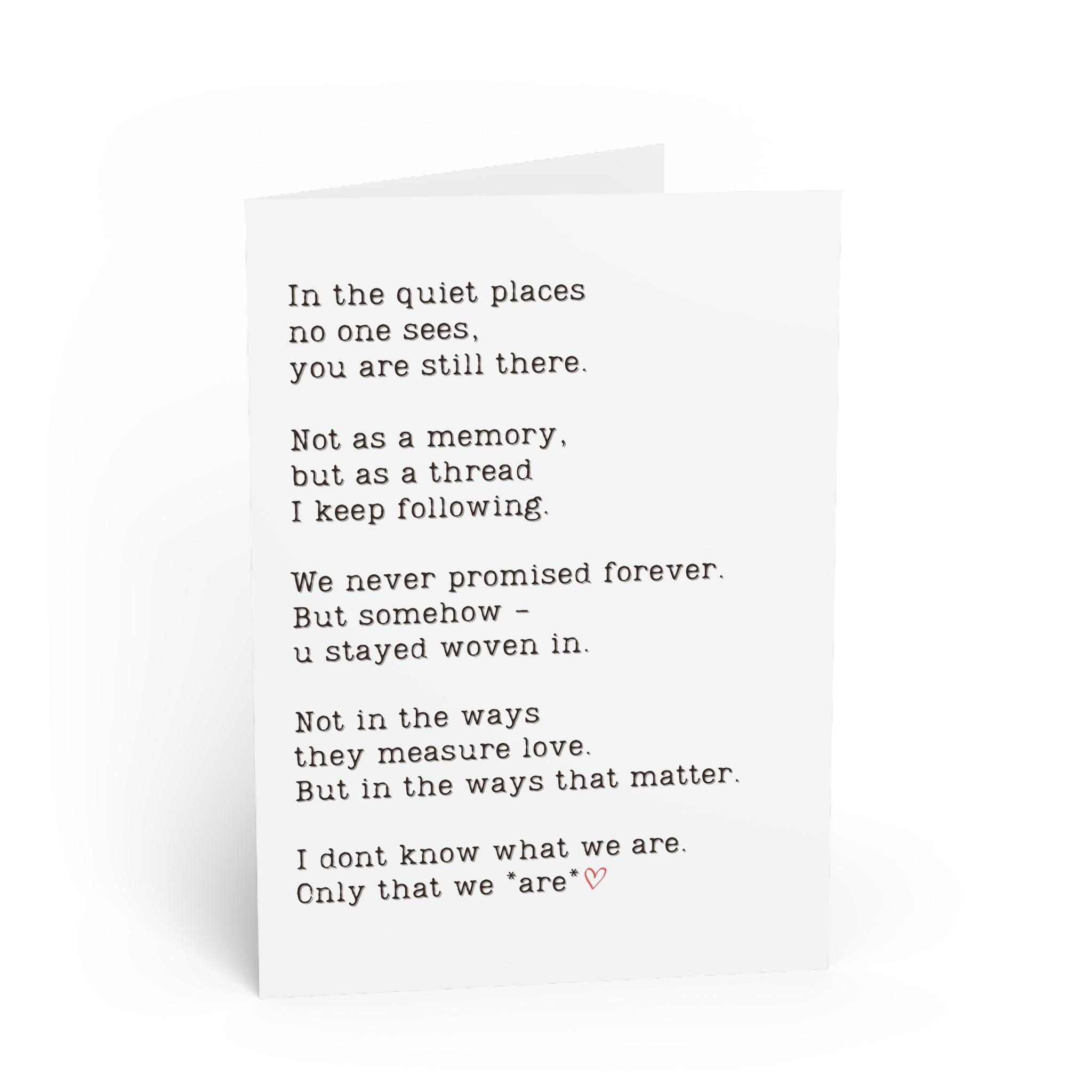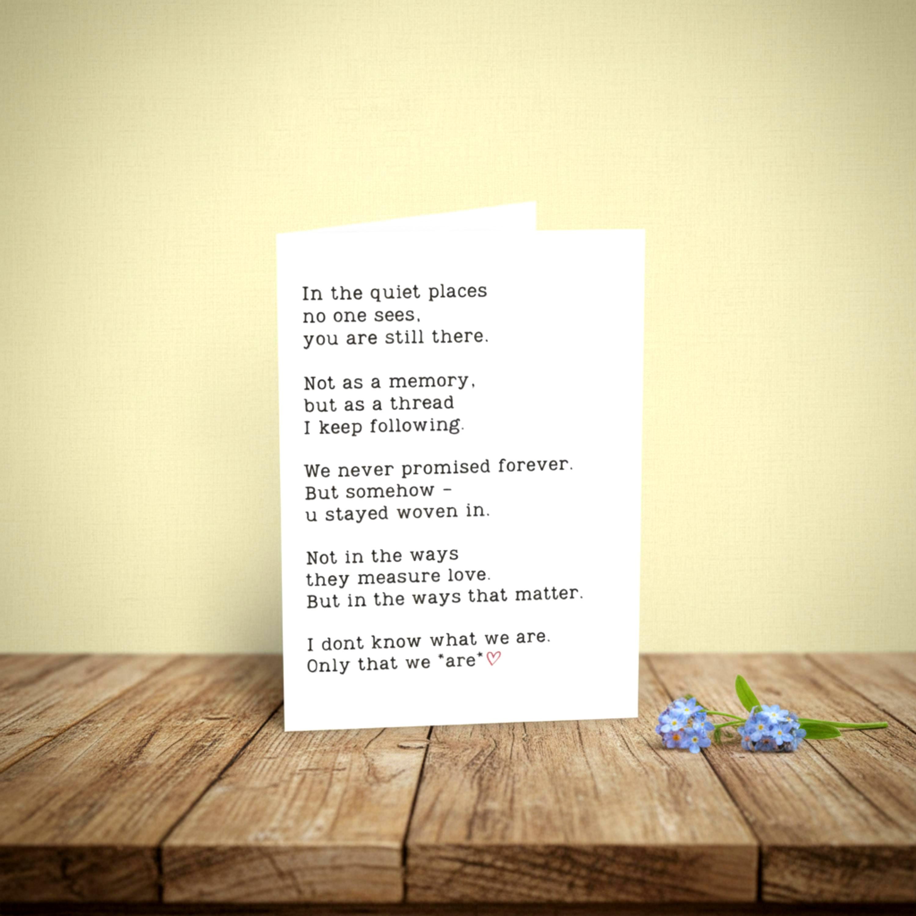 This minimalist poetry card captures the ache of deep connection - one that lingers beyond definitions, labels or endings. Whether its love, memory, or something in between, this piece speaks to the invisible threads that bind us.