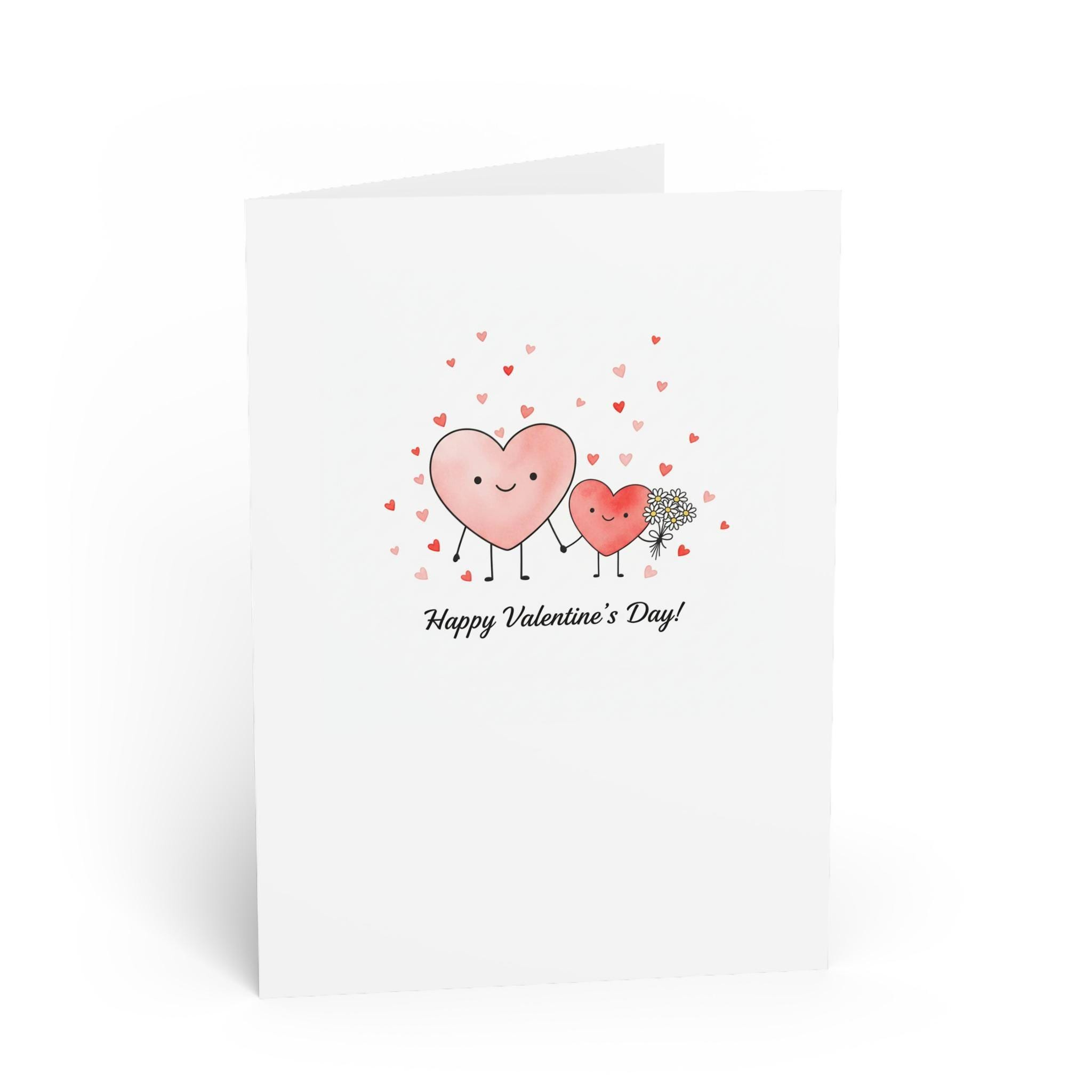 Two smiling hearts—one big, one small—stand hand in hand while a shower of tiny hearts drifts above.