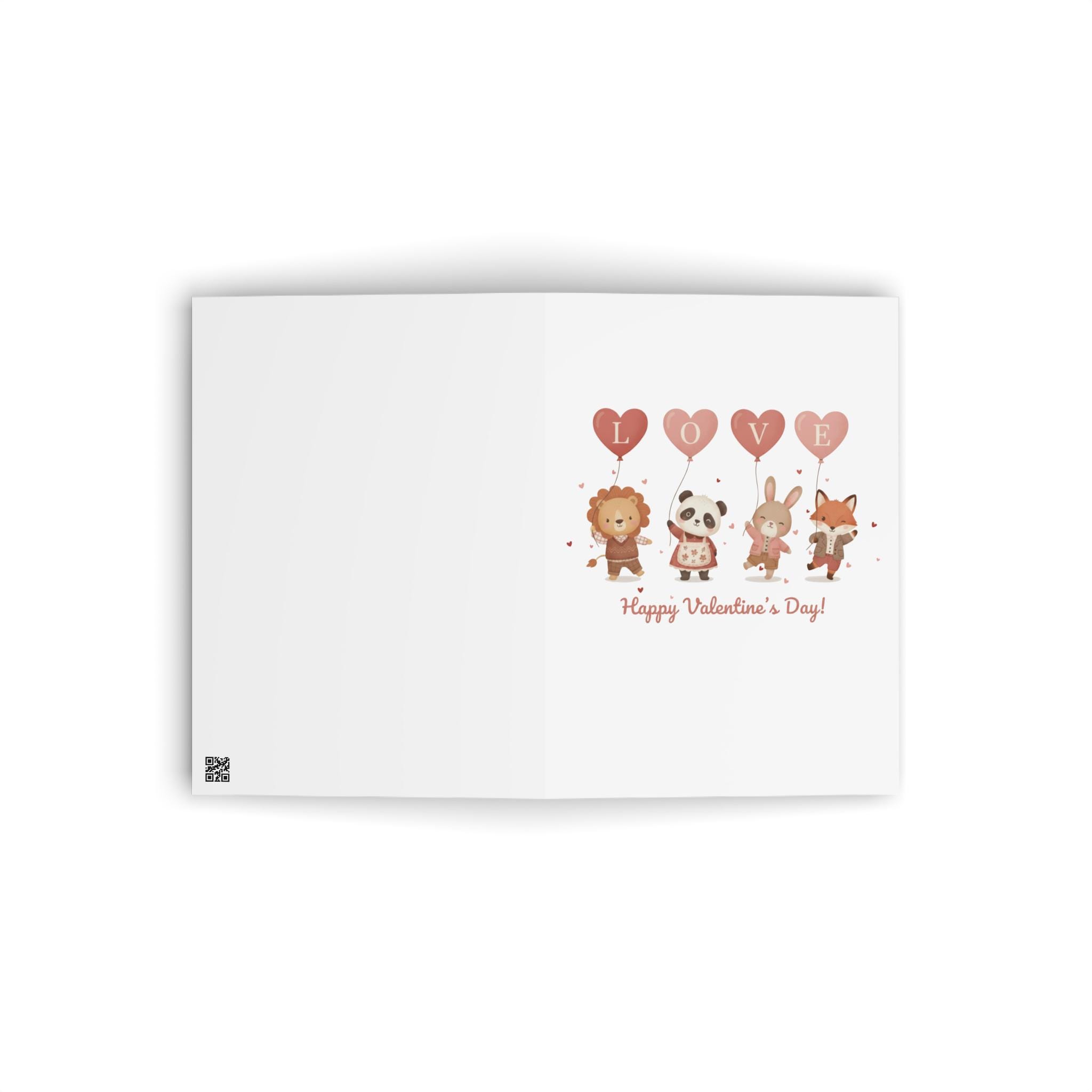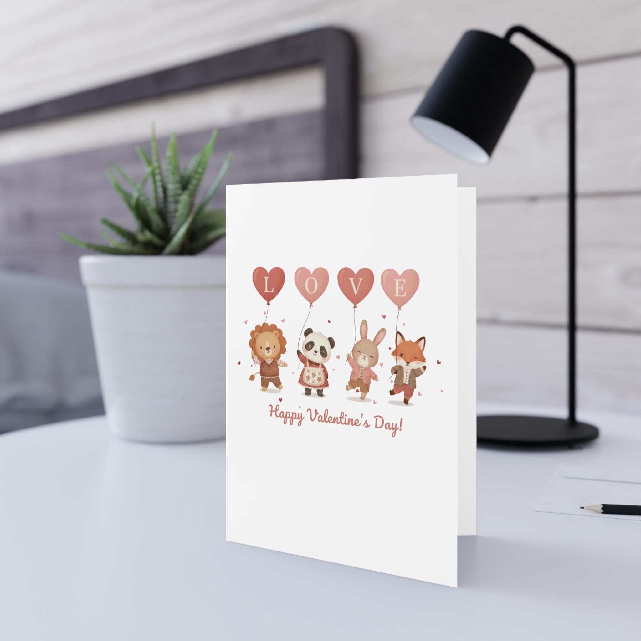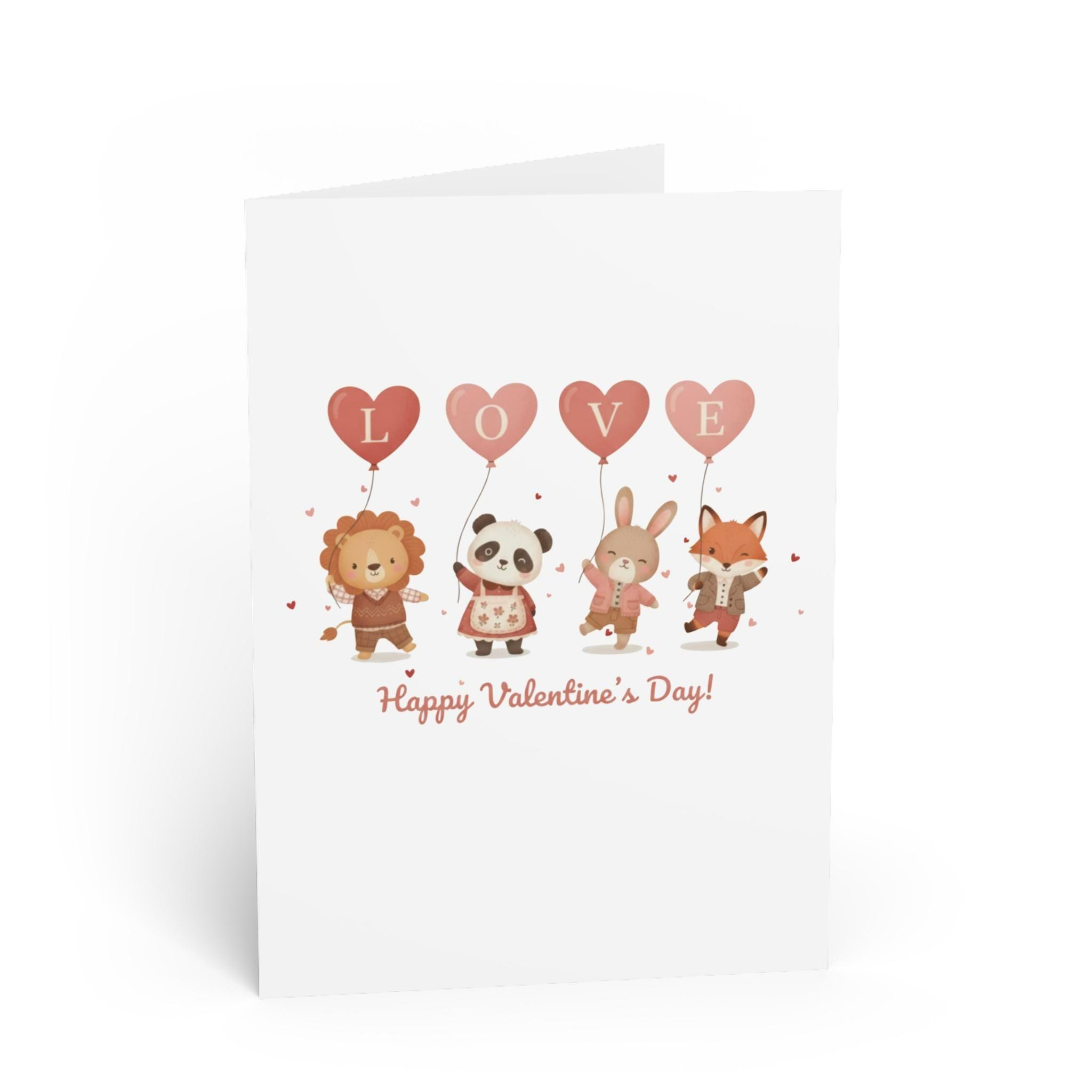 A sweet, hand-drawn valentines greeting card featuring four adorable woodland friends — a lion, panda, bunny, and fox — holding heart-shaped balloons that spell out LOVE.