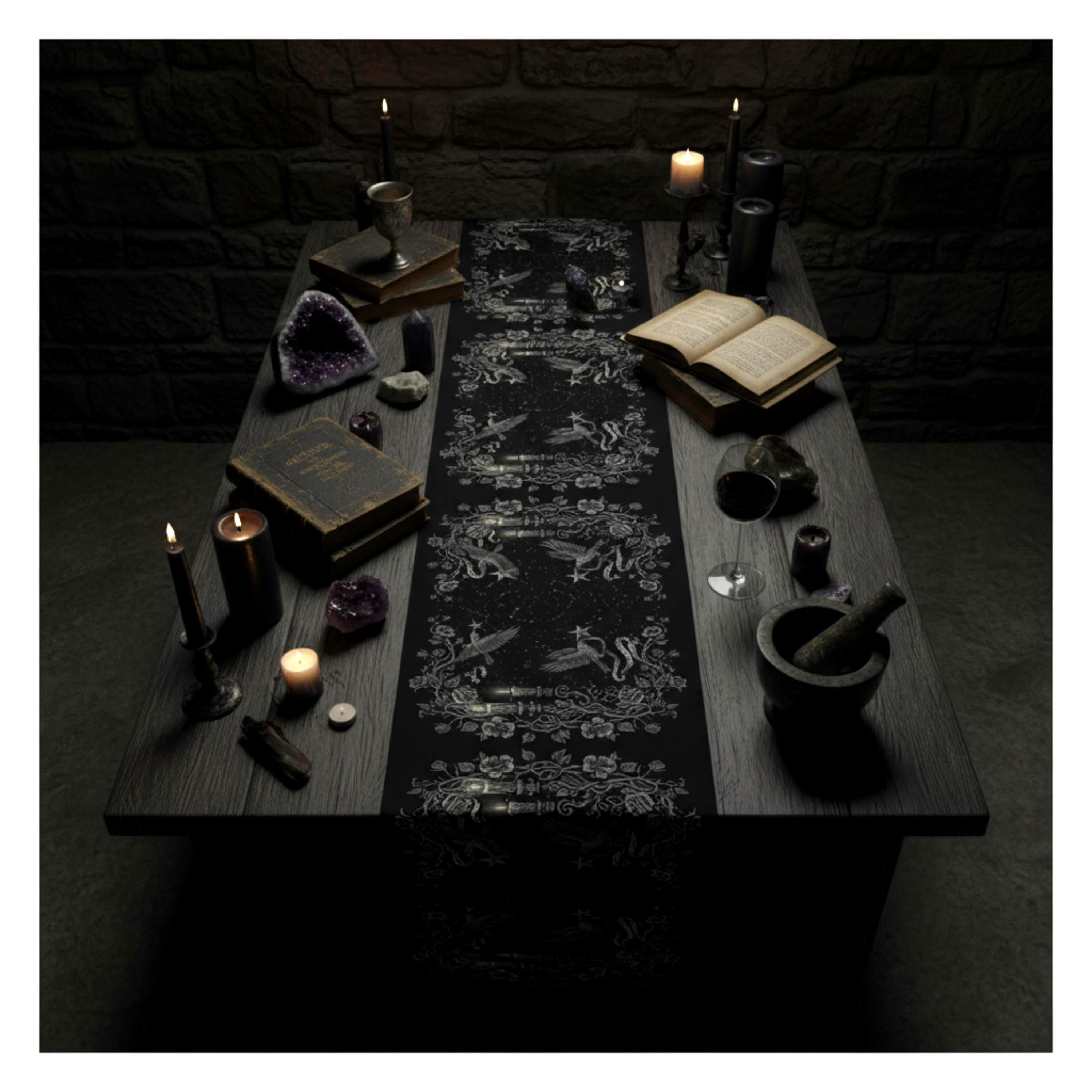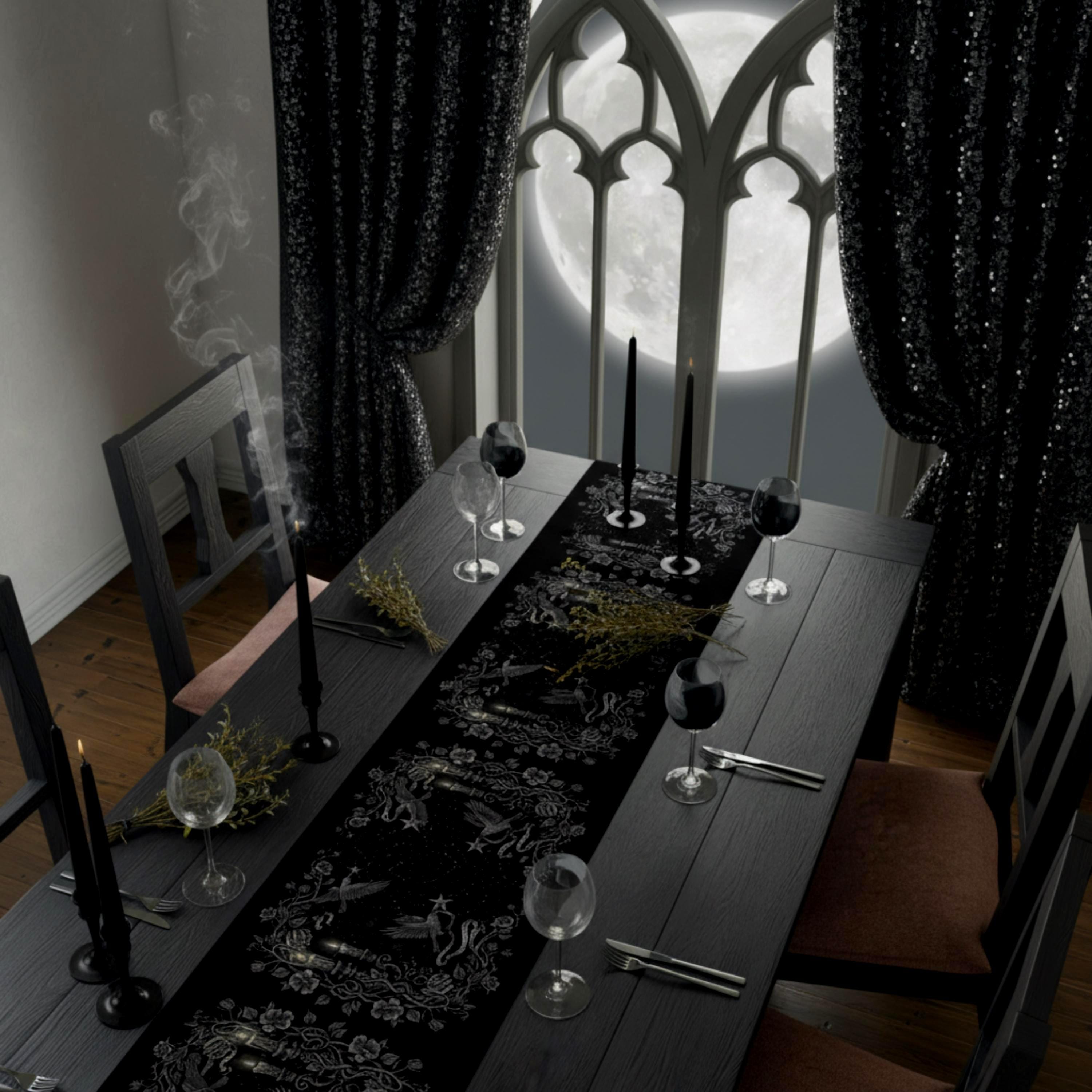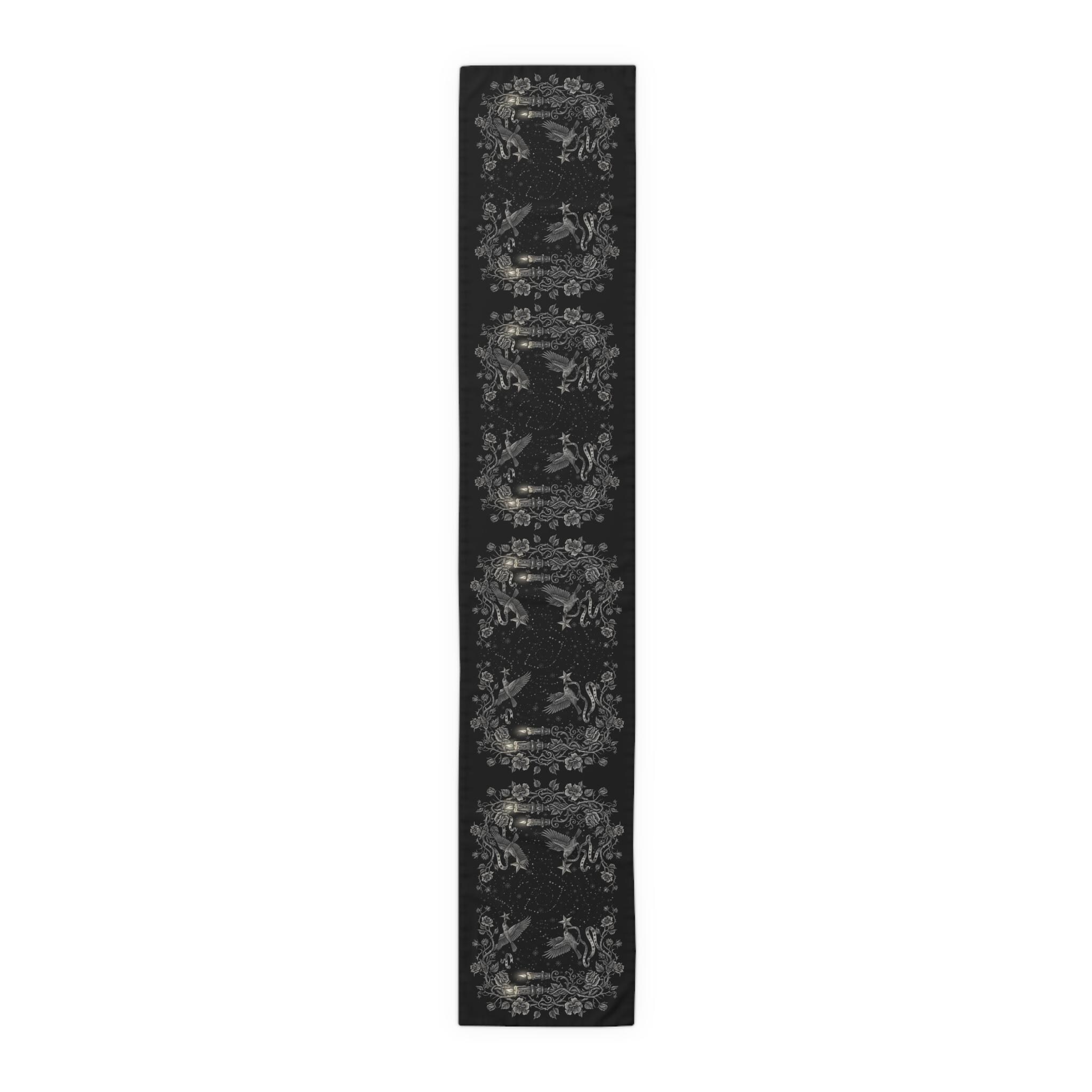 This intricately illustrated witchy table runner features a dark enchanted forest motif : winding rose vines, vintage candlesticks, and arcane symbols frame a starlit path where ravens, snowflakes and antique lanterns dance in silver etching.
