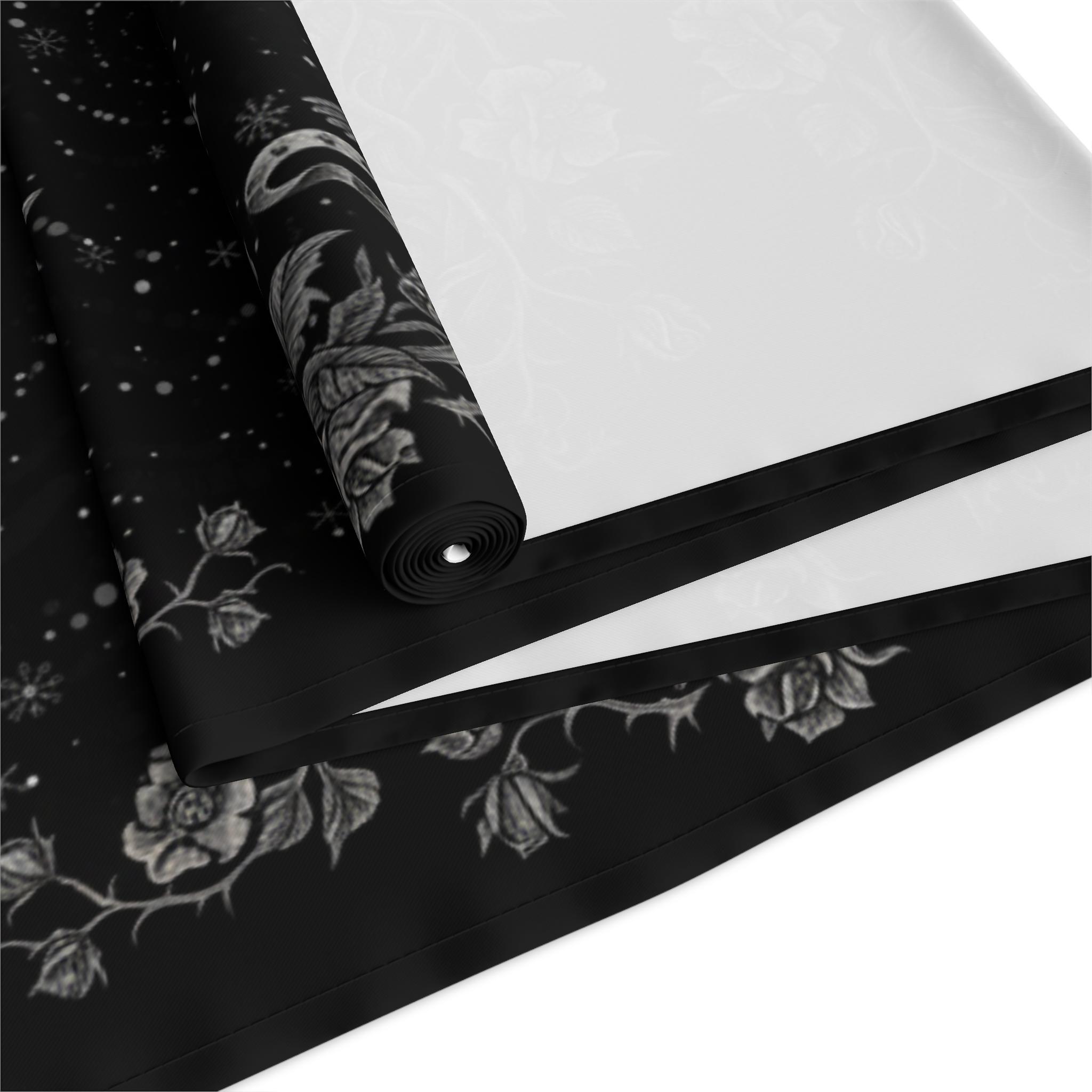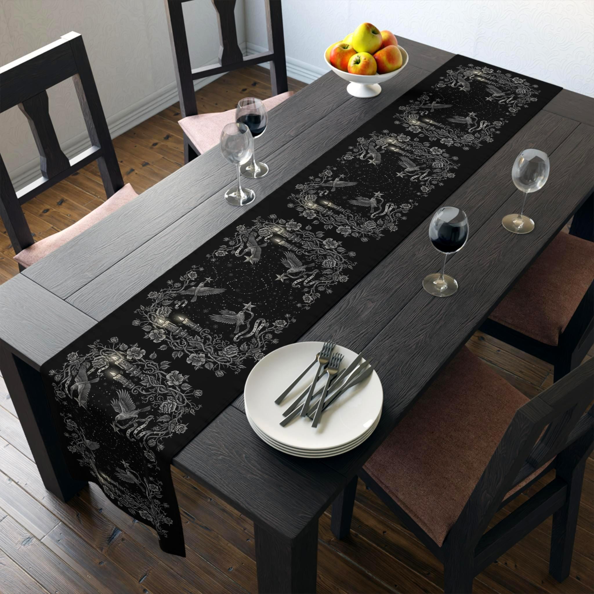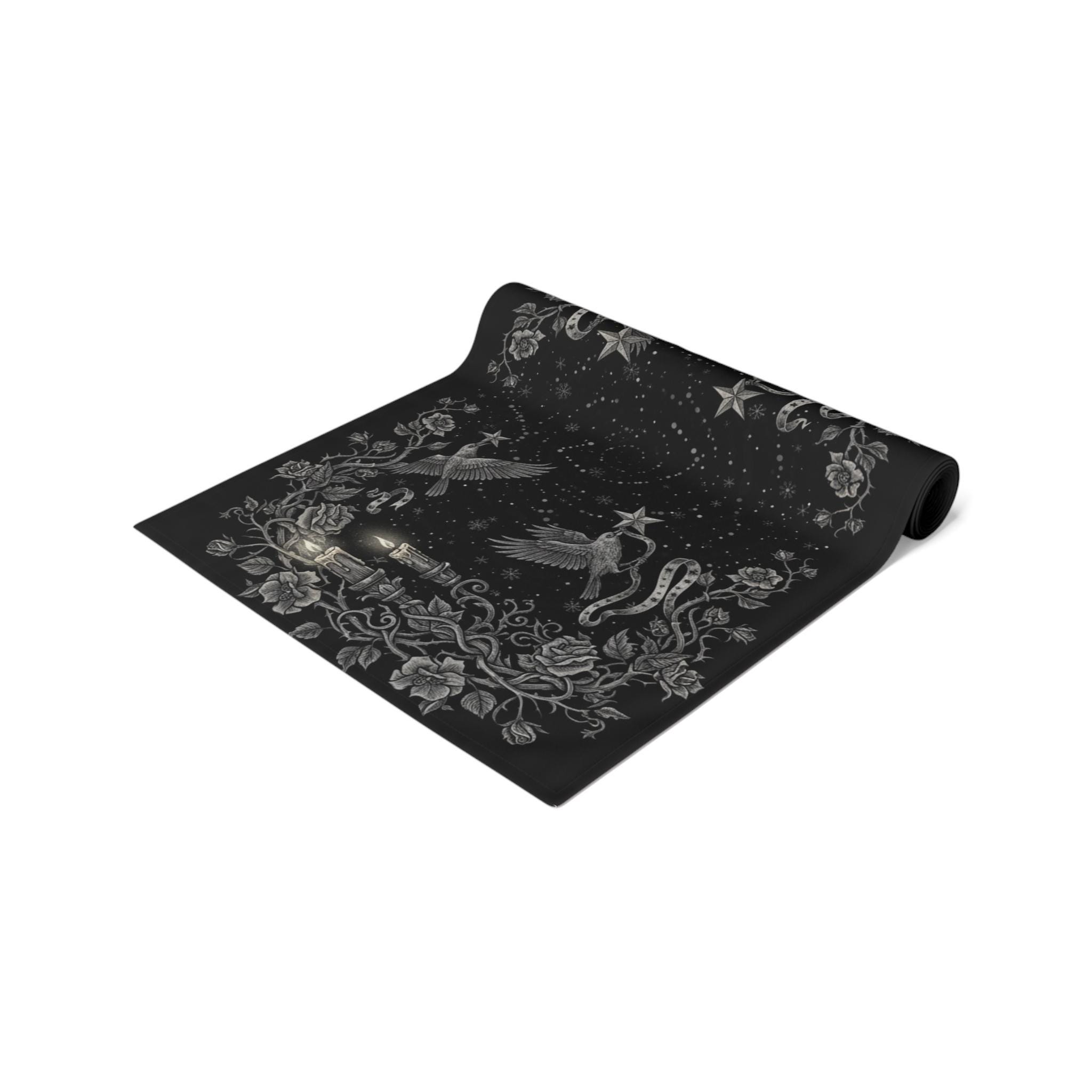 This intricately illustrated witchy table runner features a dark enchanted forest motif : winding rose vines, vintage candlesticks, and arcane symbols frame a starlit path where ravens, snowflakes and antique lanterns dance in silver etching.