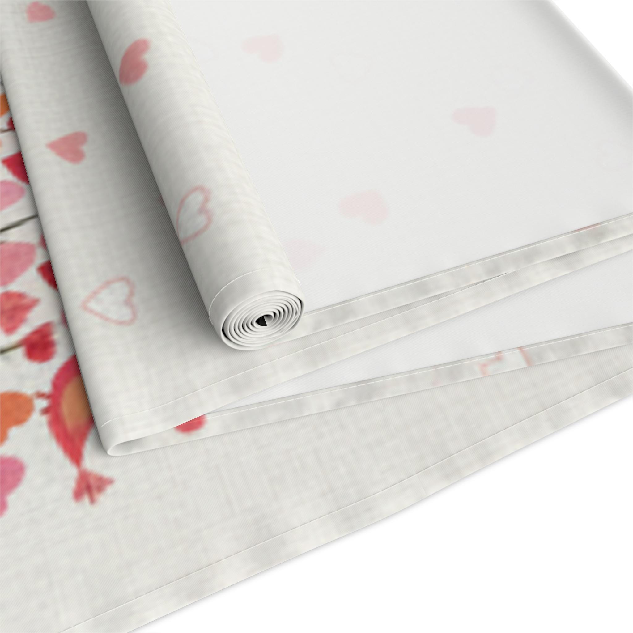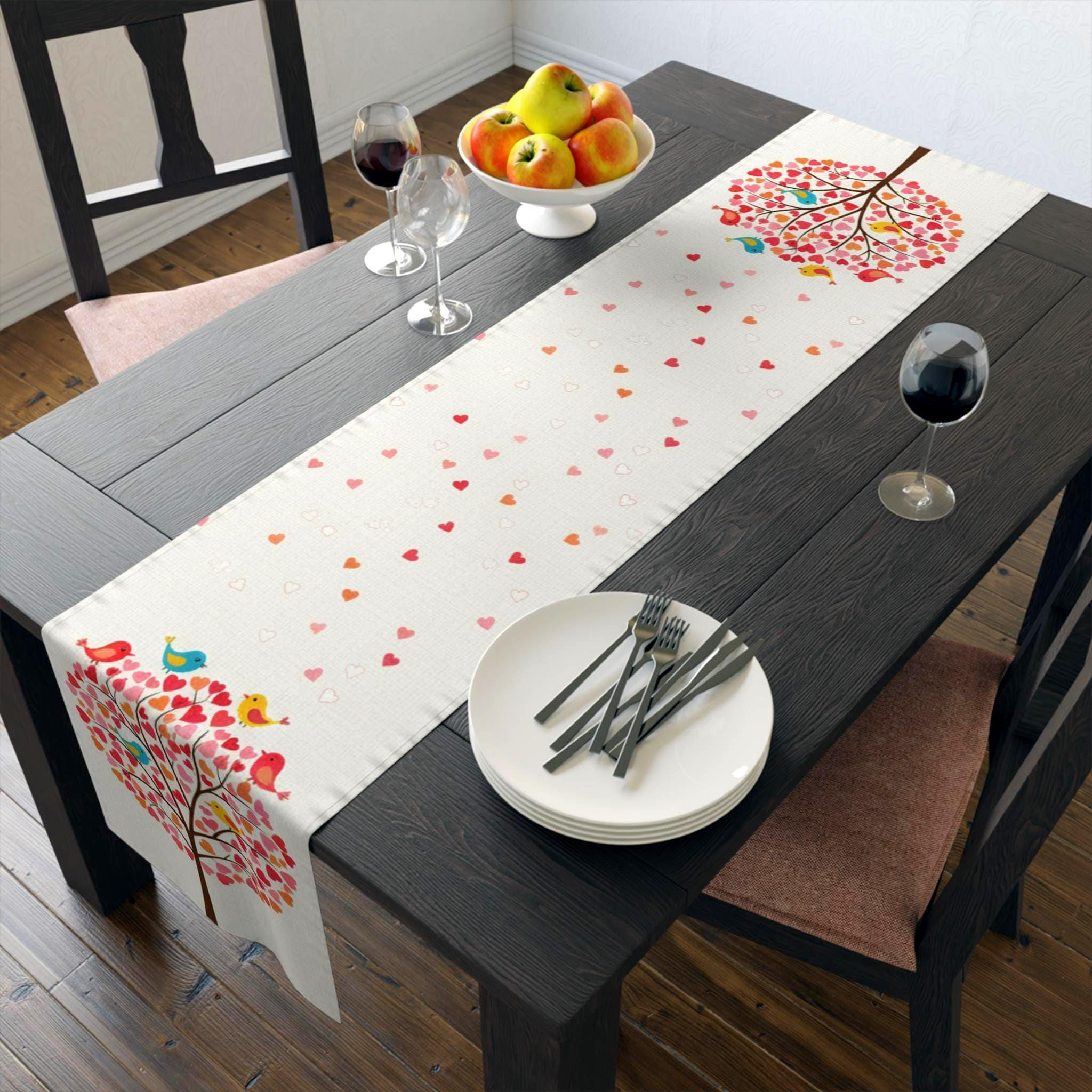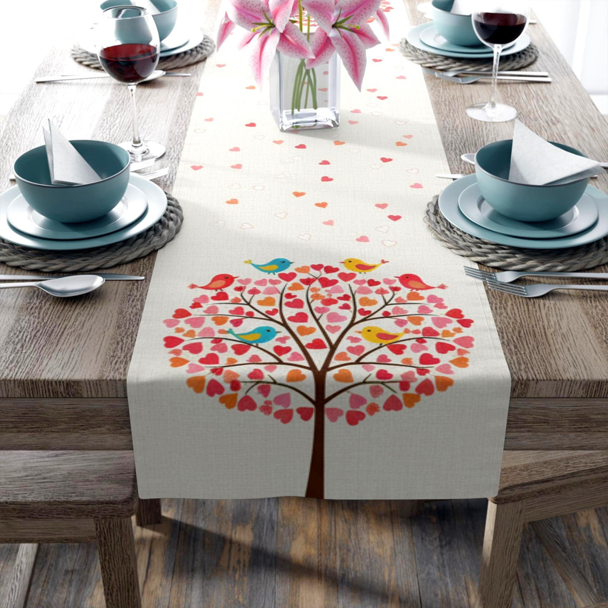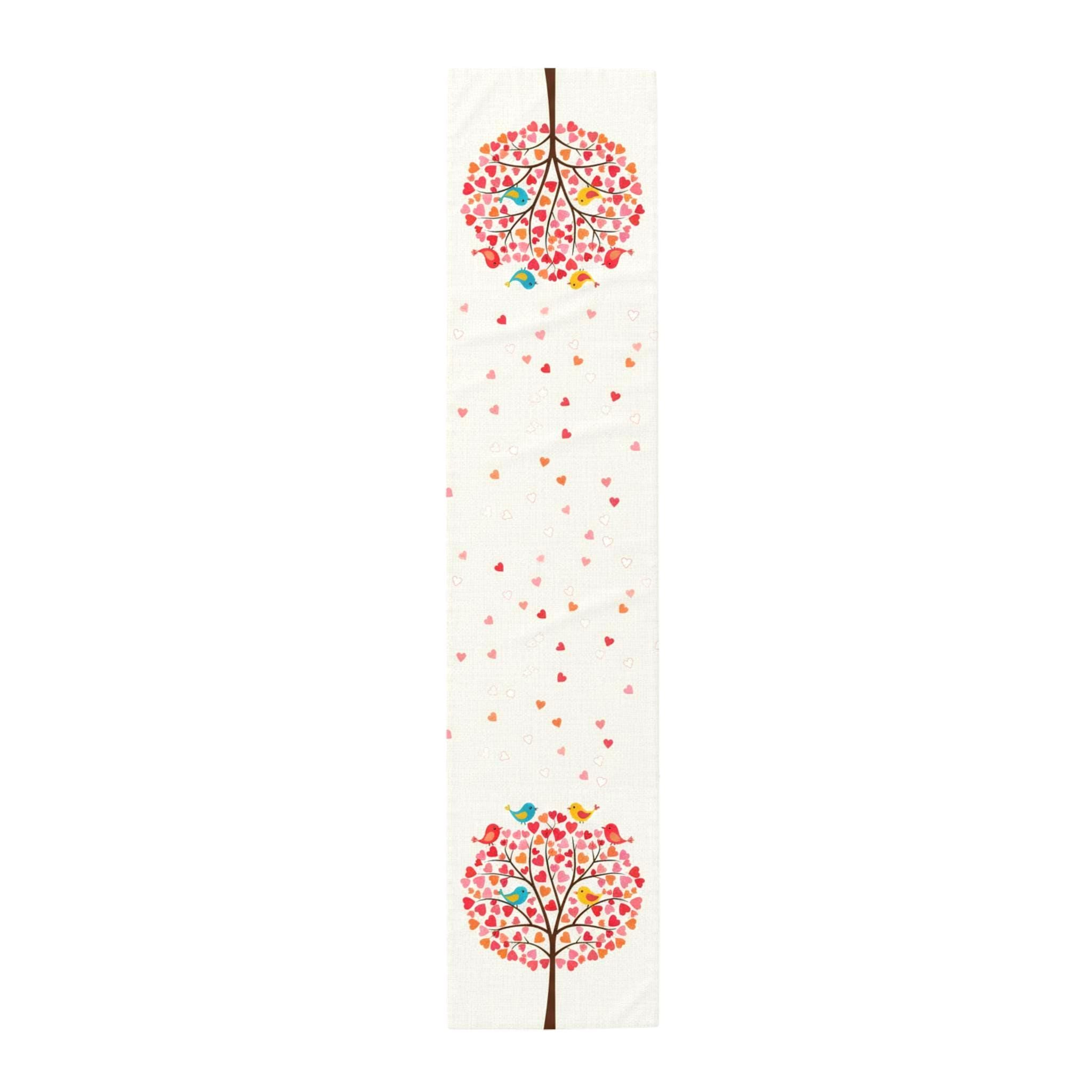 A warm, textured table runner that layers gentle romance over everyday dining. The woven beige background carries a subtle, linen-like texture while crisp white hearts and tree motifs trace a soft, organic pattern down the center.