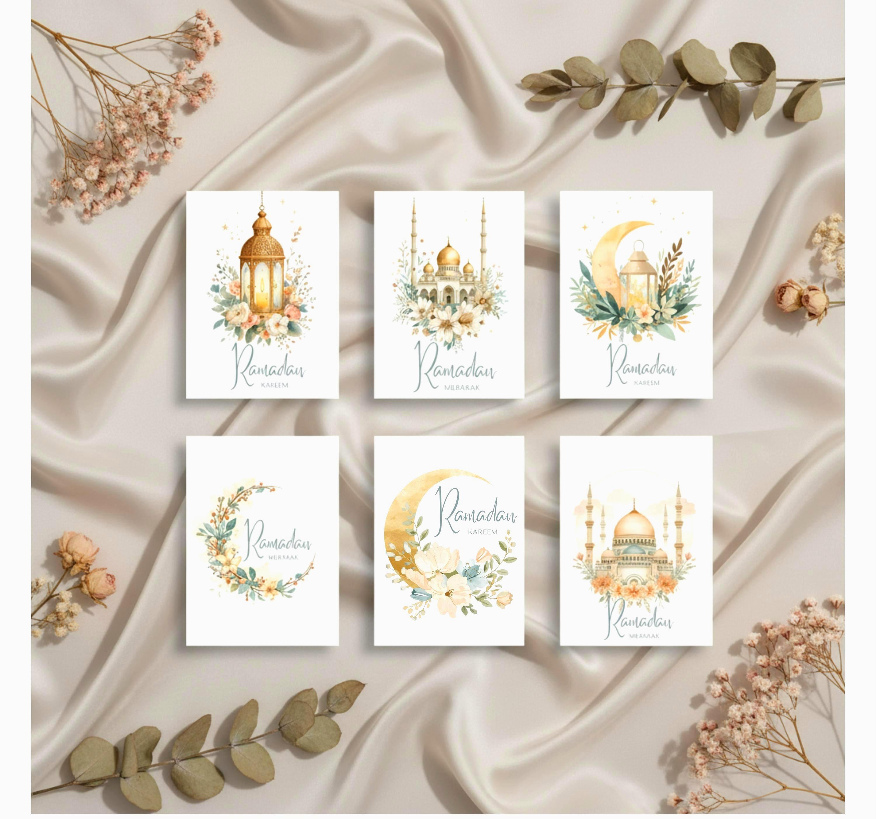 Each design features delicate Islamic-inspired artwork – crescent moons, glowing lanterns, soft florals, and timeless mosque silhouettes – all in a gentle, modern style that feels calm and uplifting.