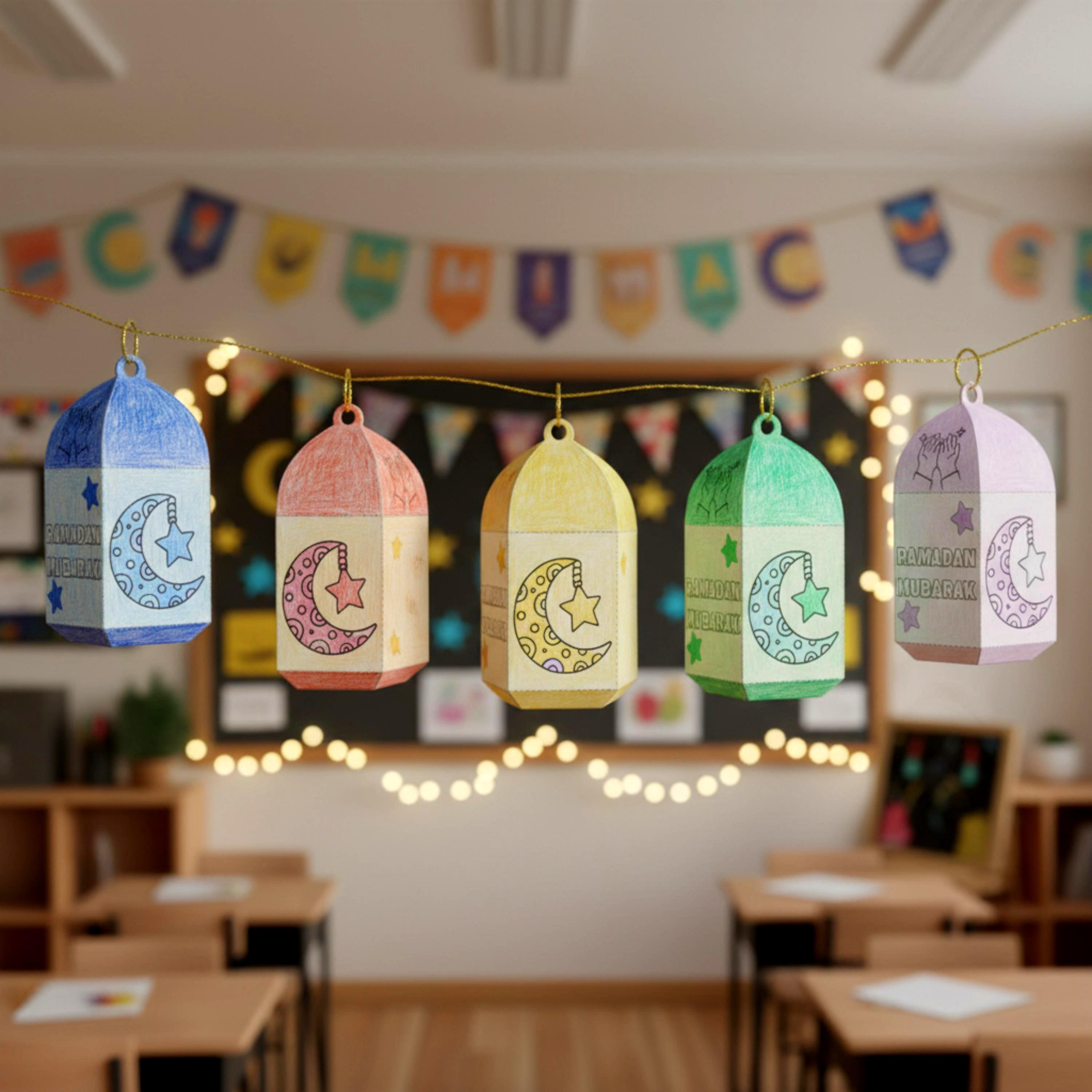 Make your Ramadan lessons easy with this printable lantern classroom craft - calm coloring, big spaces for little hands, perfect for 20-30 students.