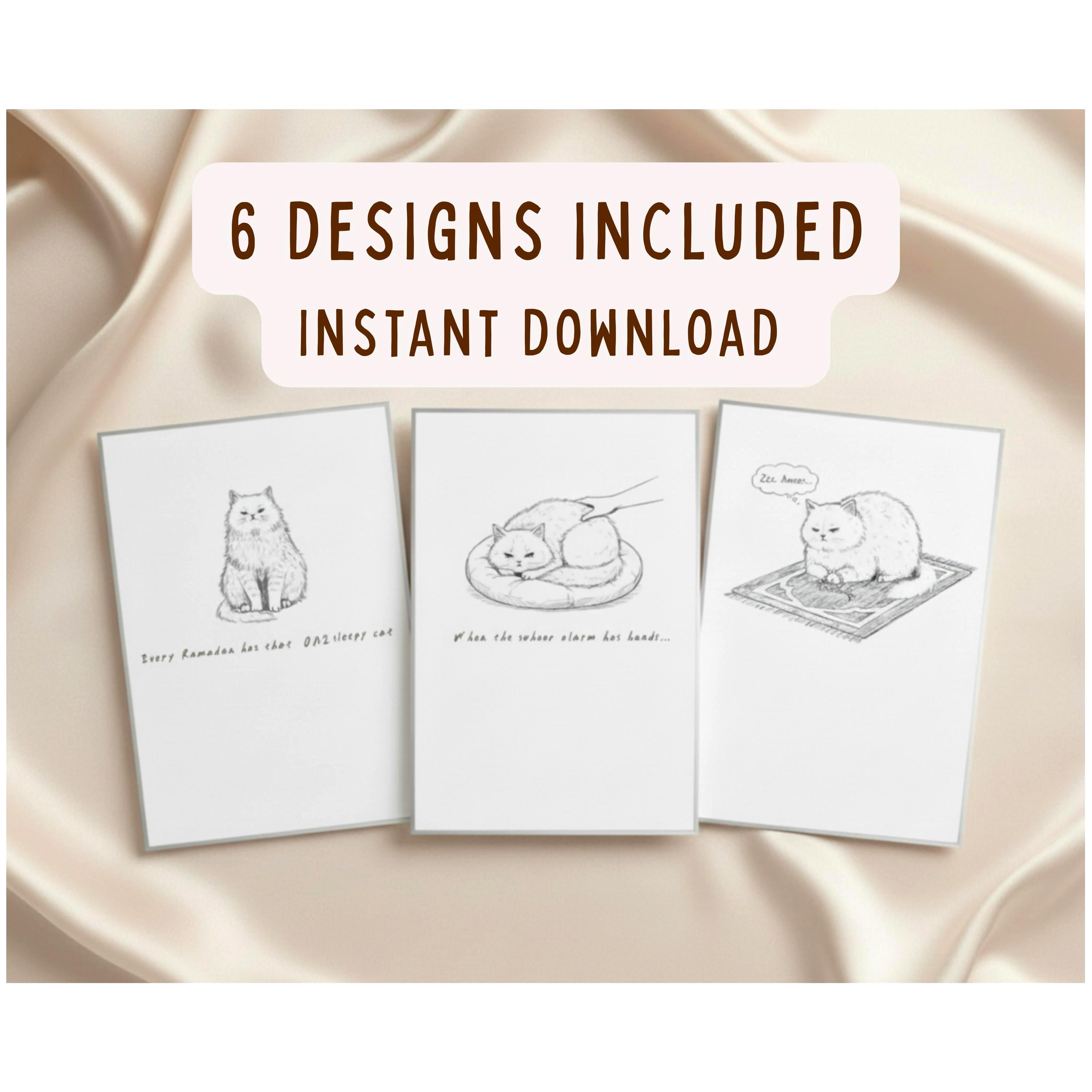 Set of 6 printable Ramadan cards featuring the same grumpy fluffy cat in different poses