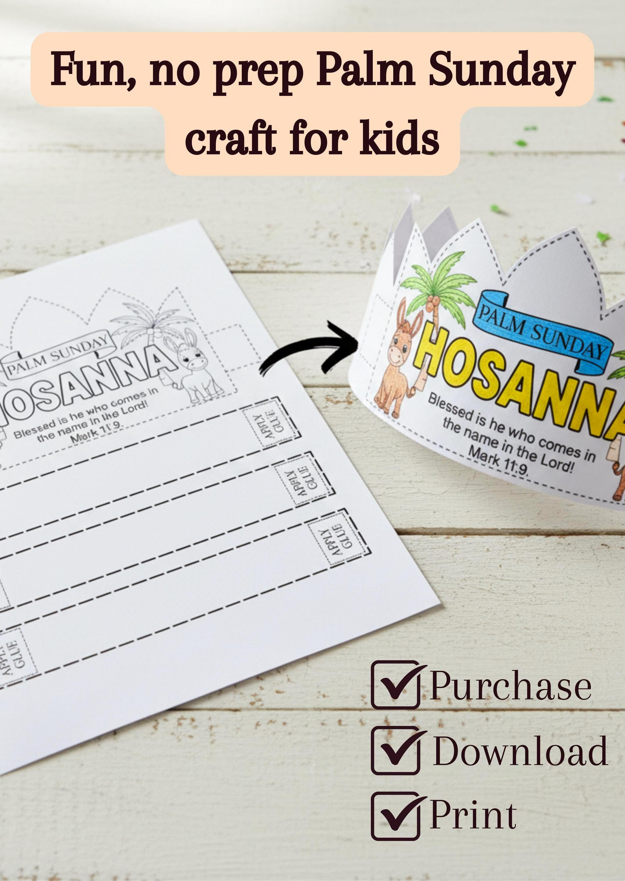 This Palm Sunday “Hosanna!” palm leaf crown creates a fun, meaningful and engaging way to teach children about Palm Sunday, Holy Week, and Easter.