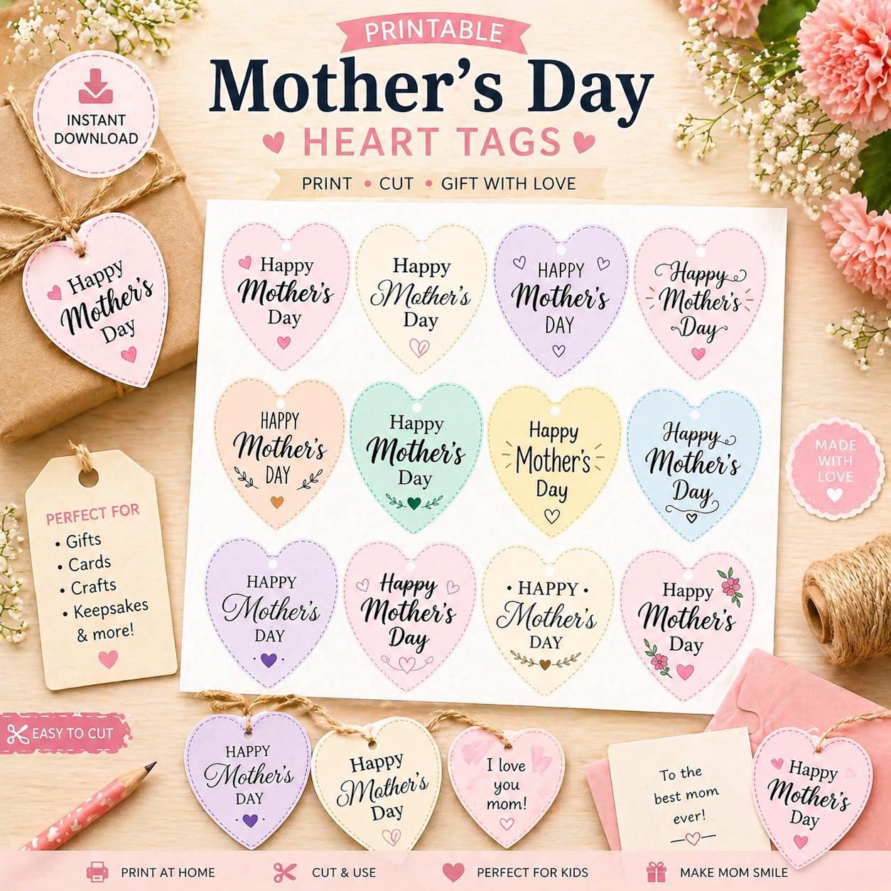 These soft pastel "Happy Mother's Day" heart tags are perfect for turning simple gifts into meaningful keepsakes. Whether you're wrapping a present, decorating a card, or doing a fun craft with your child, these tags add a beautiful handmade touch.
